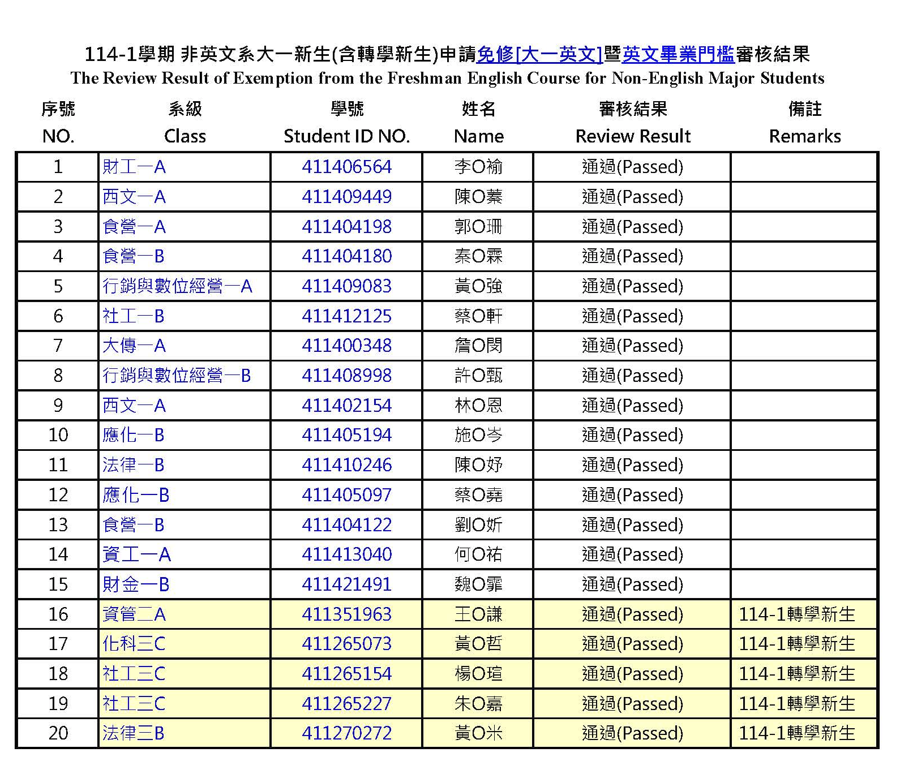 【外語教學中心】114-1學期 本國籍非英文系大一新生(含轉學新生)__申請免修 [ 大一英文]__審核結果
