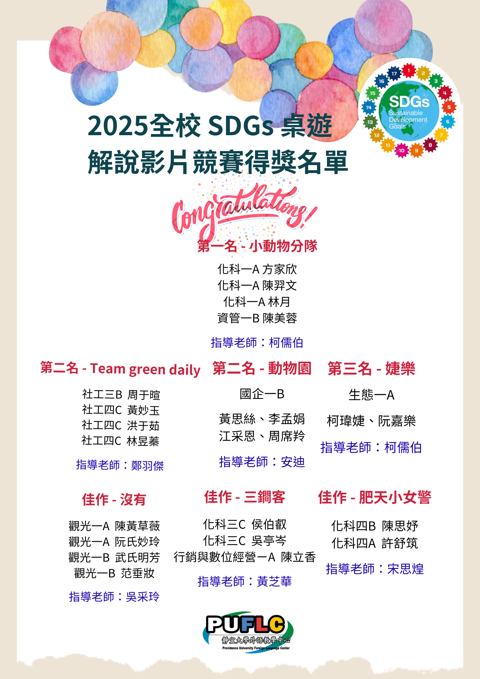 【外語教學中心】2025 Fall Semester 全校 SDGs 桌遊解說影片競賽-獲獎名單