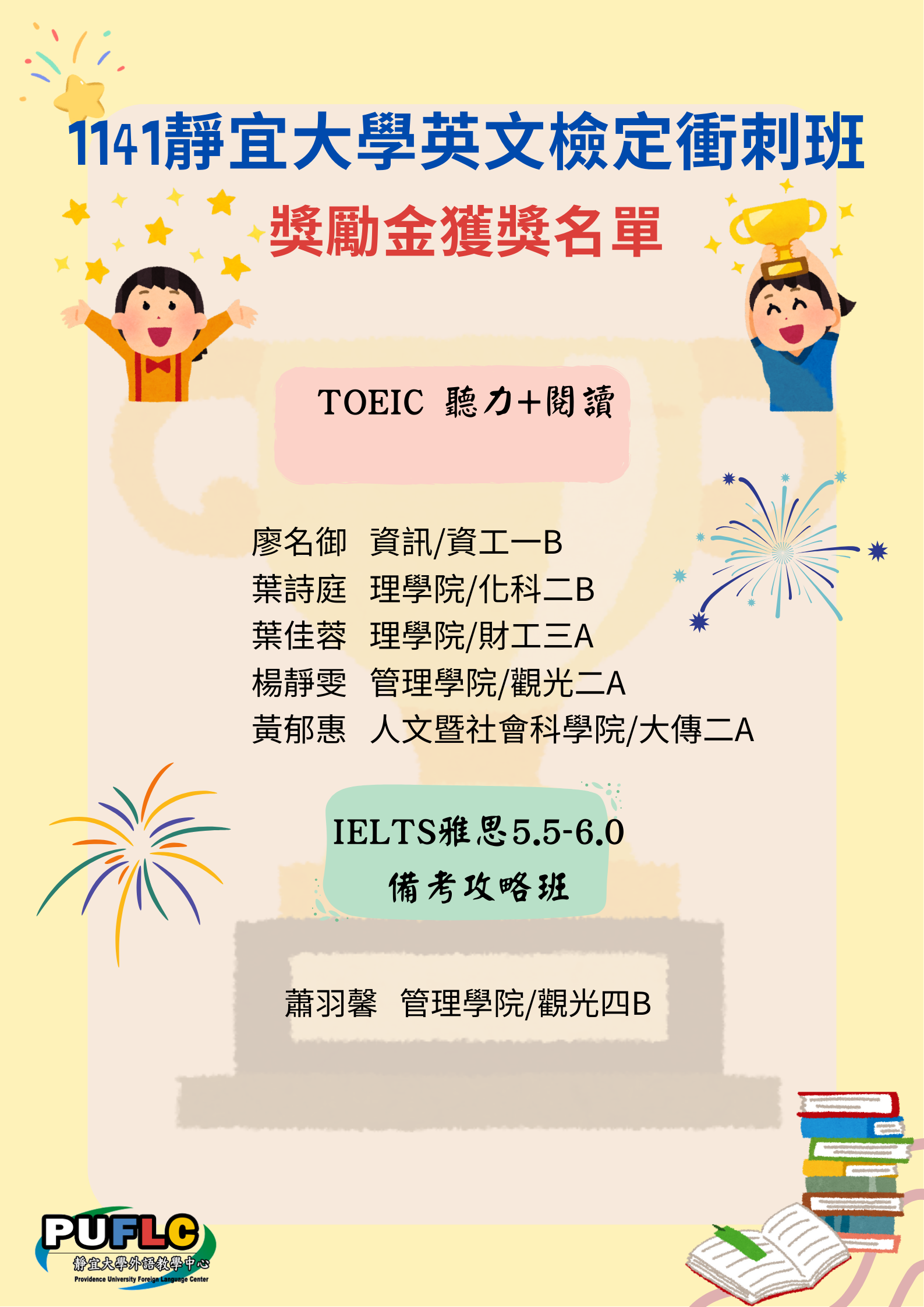 【外語教學中心】114-1英文檢定衝刺班獎勵金獲獎名單
