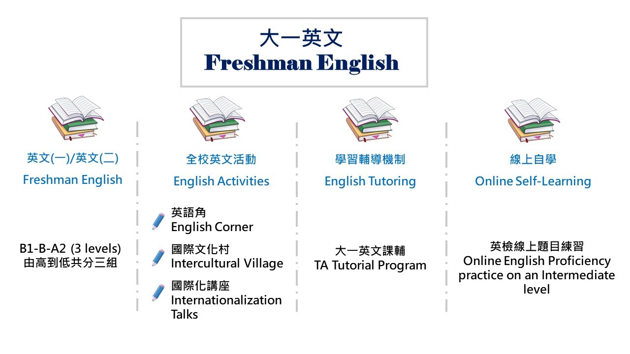 Applications may be submitted to the Foreign Language Center (FLC) from winter break until the end of Week 1 of the second semester. Application forms are available for viewing and download on the FLC website. - Since the 101th academic year (2012/2013), Freshman English courses at all levels have been standardized. Instructors follow the unified syllabus, teaching objectives, and teaching activities to complete the course schedule. Beginning in the 111th academic year (2022/2023), the midterm assessment is conducted in the form of a project (presented either in written or oral form), while the final exam is administered online.